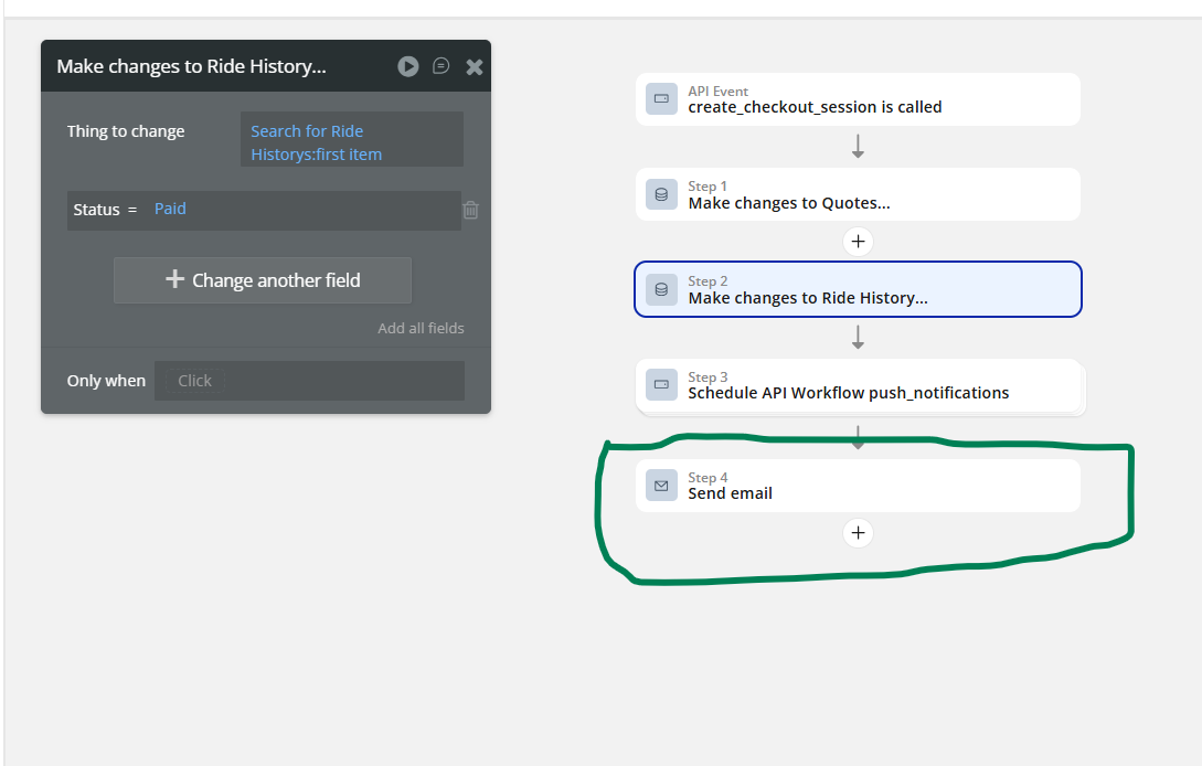 If the send email action is firing, then seems like the issue is in that “Search for Ride History” expression (and/or in step 1’s change to Quote if step 2 is dependent on it). The Ride History record is not being found.