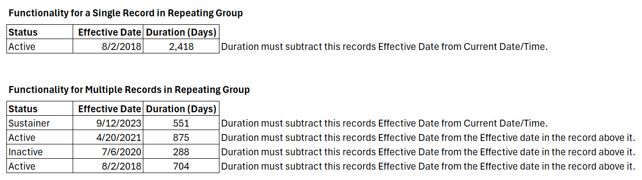 In the RG I would like each record to display the number of days the member has spent in the respective Status, this would be called Duration. It would require the Effective Date of the very first record created for a member to be subtracted from the Current Date/Time. Once a second record is created, the Duration of the very first record would need to then be subtracted from the most recently created Effective Date instead of Current Date/Time, and the most recently created records Effective Date would need to be subtracted from Current Date/Time.