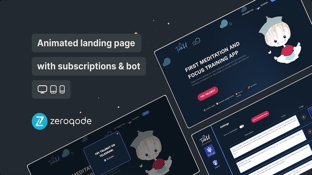 This Telegram Bot is a copy of Zenify Focus & Mindfulness Bot (can be installed here). It comes with a stunning animated landing page, user page to subscribe to a stripe plan, and all main bot commands pre-configured (/settings, /help, send message, send audio, send invoice, etc,) it comes with a Telegram Plugin for Bubble which costs $10/month. For more instructions how to create a bot and set a webhook please see here]