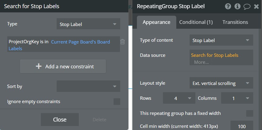 My repeating group is set to search for labels with the constraint ProjectOrgKey is in the relevant DB field for the Project’s Board (which is a list).