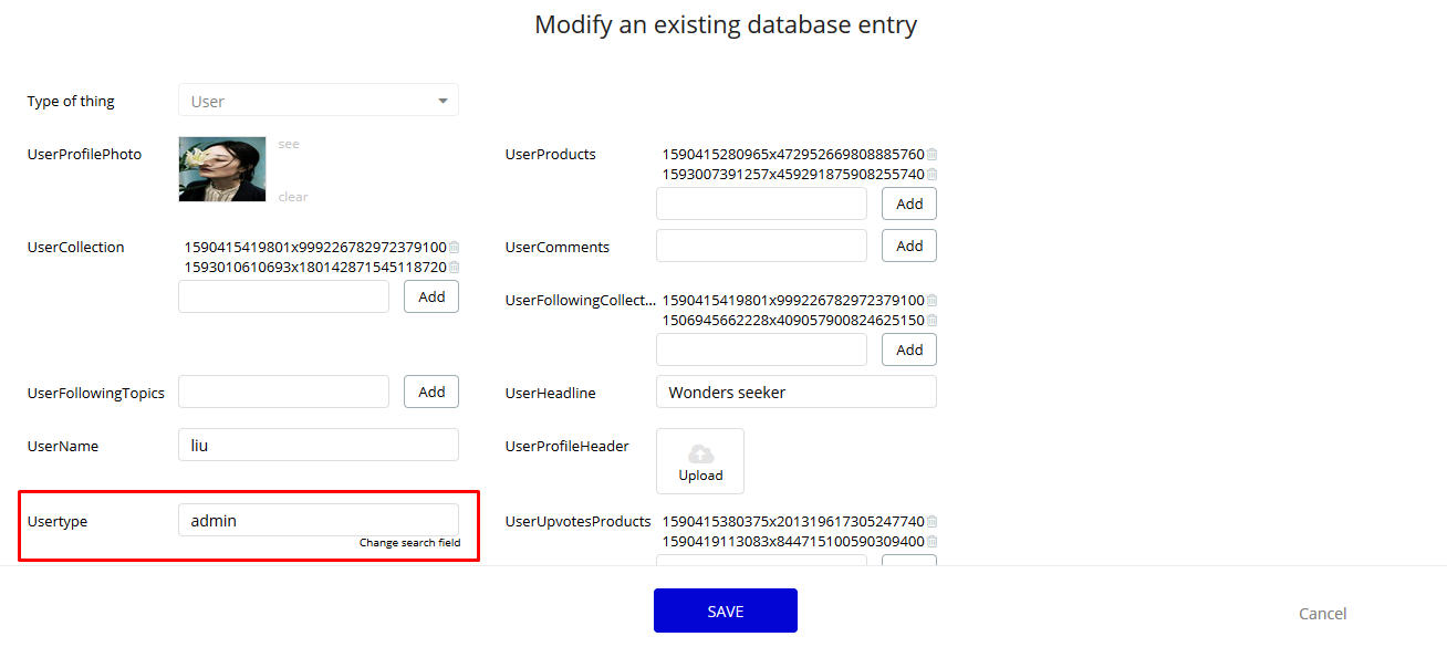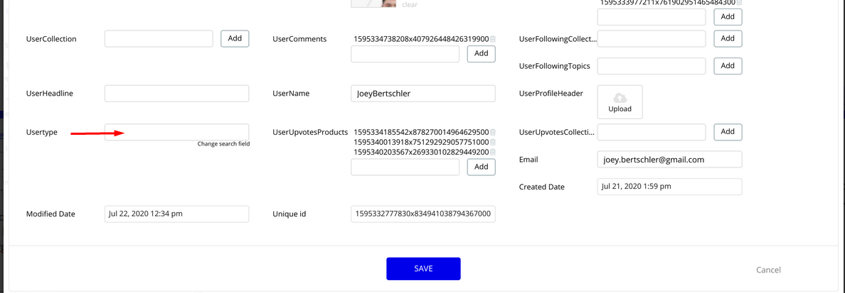 And you’ll be able to easily type in the admin value into Usertype field, and everything will run smoothly. You’ll be able to access admin features from your dashboard and interact with UI as supposed to be. However, even with the default unique id is still possible to grant the admin rights to a user, but you’ll just need to type in its unique id value, accordingly. But template is built with a condition for Usertype’s name, so the best thing is to change the primary field to this one.