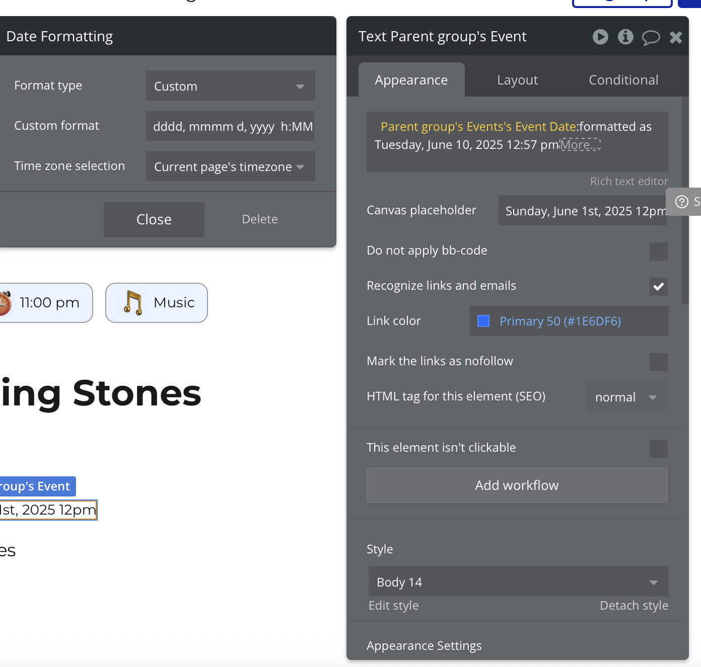 You think it would be easy to set a text element to show a date and time. But no. No it is not. I have a group tied to a table with the type of content set to Date. Then in the group is a text element that I want to show the date AND TIME from the modified field in my table. This should be beyond simple, yet it is not. Ironic considering bubble is a platform to design websites and apps.