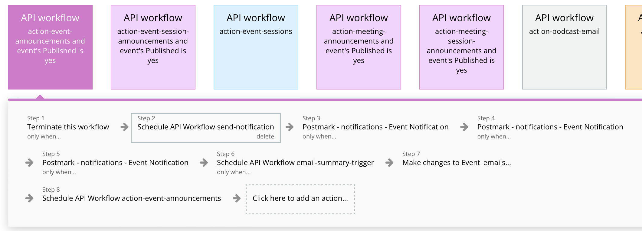When an announcement is triggered I run it through several workflows to determine the final list. Some events have restrictions based on things like if it’s member only, location specific, if they already registered for the event, etc. Once I have that final list it gets sent the the attached workflow.