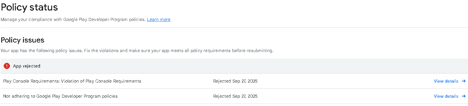 Your app has been rejected and wasn’t published due to the policy issue(s) listed below. If you submitted an update, the previous version of your app is still available on Google Play.